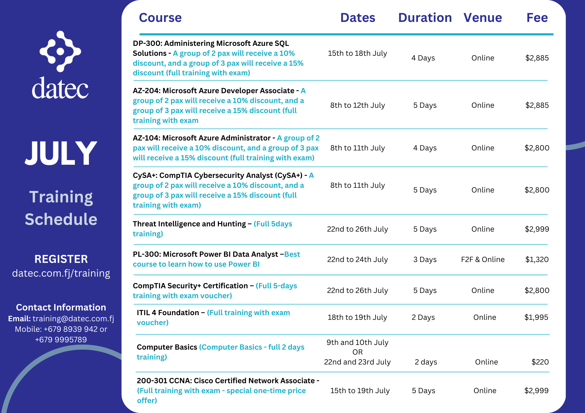 Kindly see the attached 2024 training calendar and this month's training flyers (including ITIL 4, CompTIA Security+, and more) for detailed information on related ICT courses.