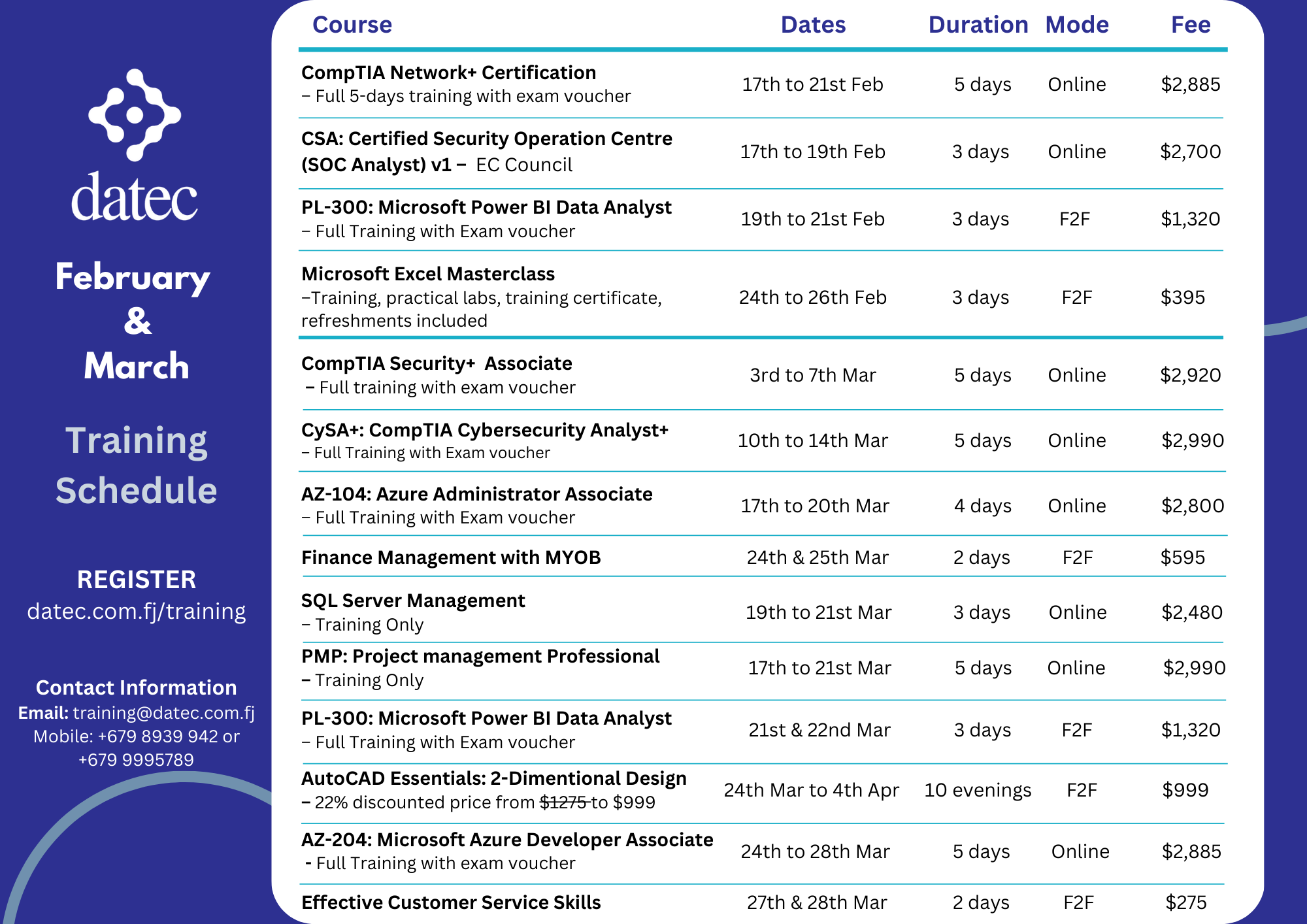 Kindly review the flyer below for all upcoming courses. You may click on the "Enroll Now" button to send us your free registrations to learn more about a particular course.